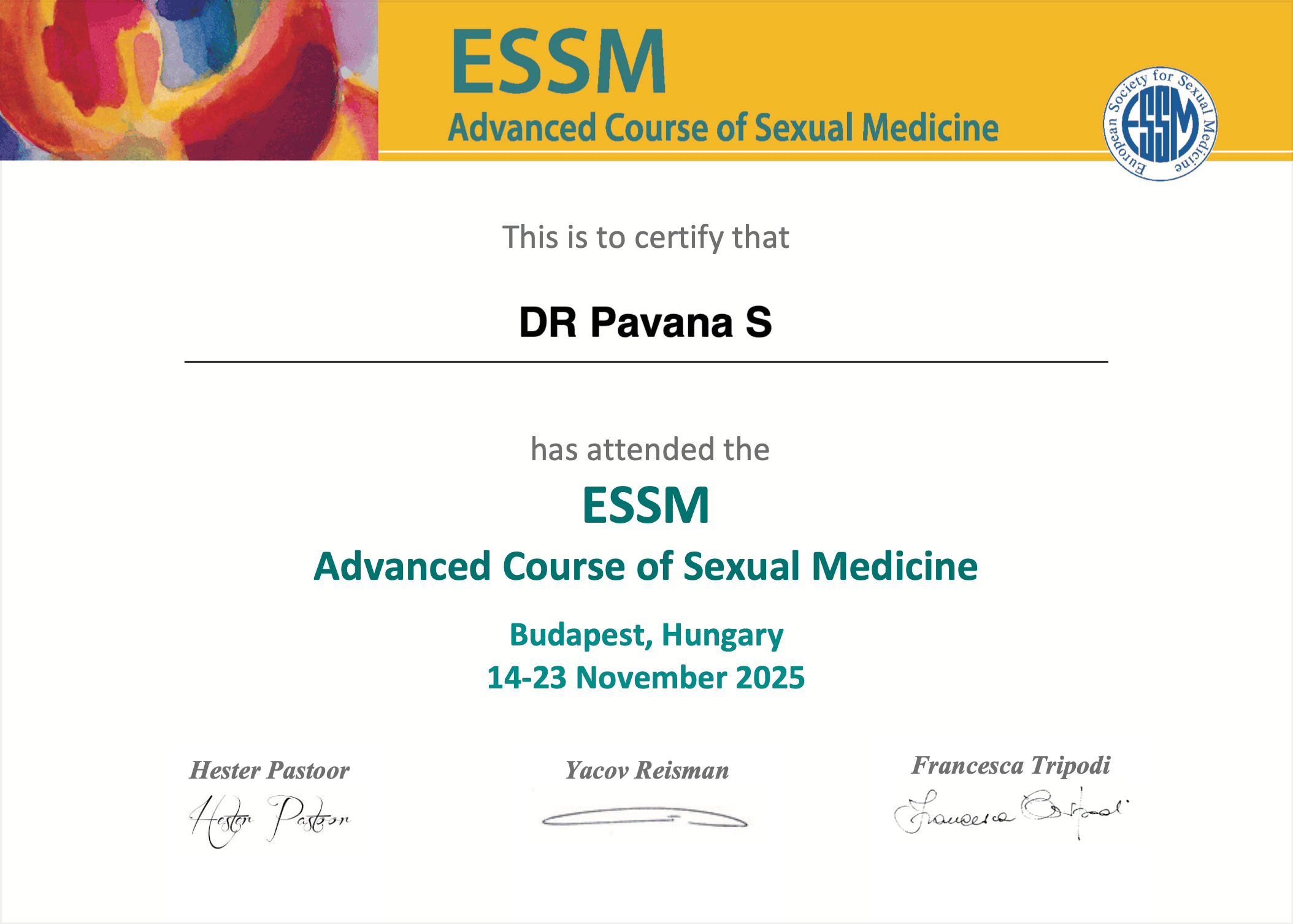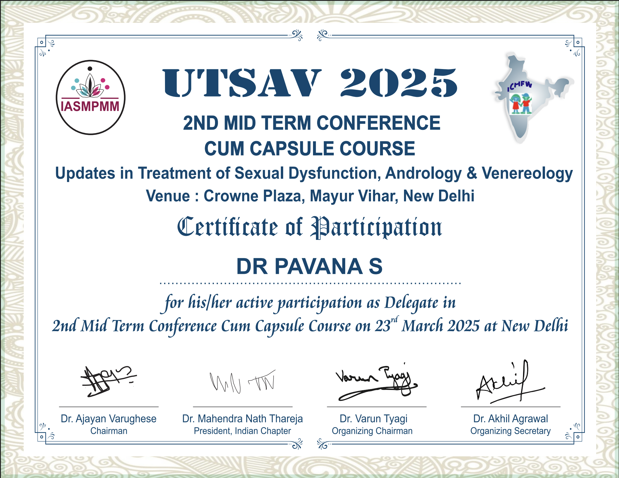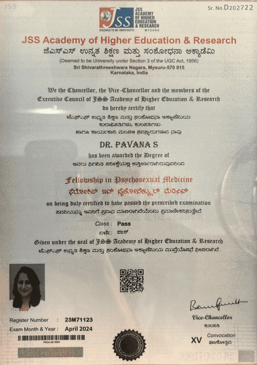 Fellowship in Sexual Medicine from the distinguished European Society of Sexual Medicine (ESSM) and JSS University in Mysuru